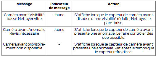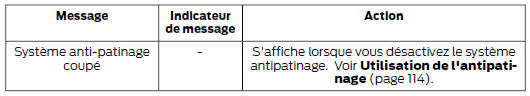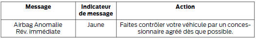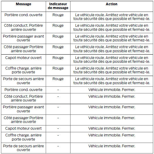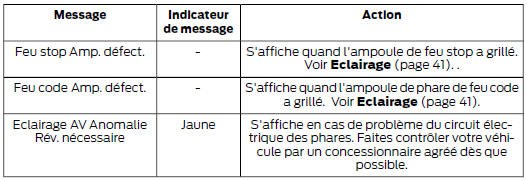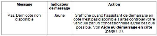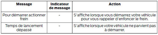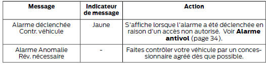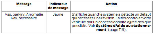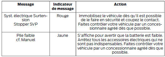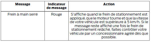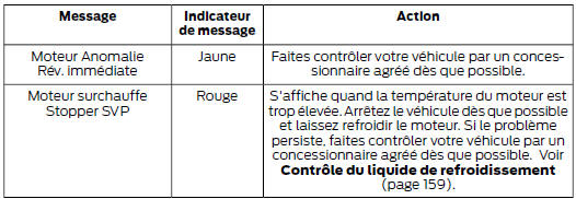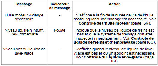 Note : en fonction des options dont votre véhicule est équipé, tous les messages ne s'affichent pas et certains peuvent ne pas être disponibles. Certains messages peuvent apparaître abrégés ou tronqués en fonction du type de combiné d'instruments de votre véhicule.